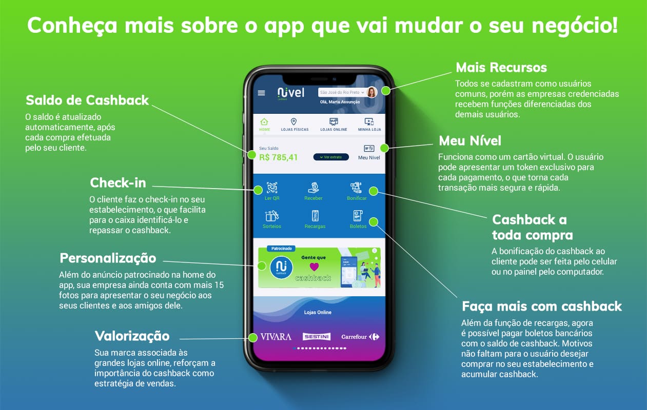 O app Nível Cashback foi desenvolvido em uma plataforma altamente tecnológica, que além de gerenciar o cashback, gera grande atração em um grupo de network, juntamente com uma poderosa fixação de marca.